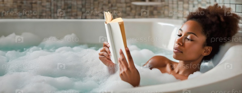 Женщина расслабляется с книгой в пузырьковой ванне с безмятежным декором