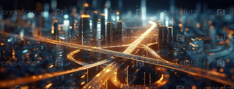 Шумный город ночью с сияющими автомагистралями, плетениями небоскребов. Городской пейзаж со освещенными дорогами ночью. Панорама с копировальным пространством