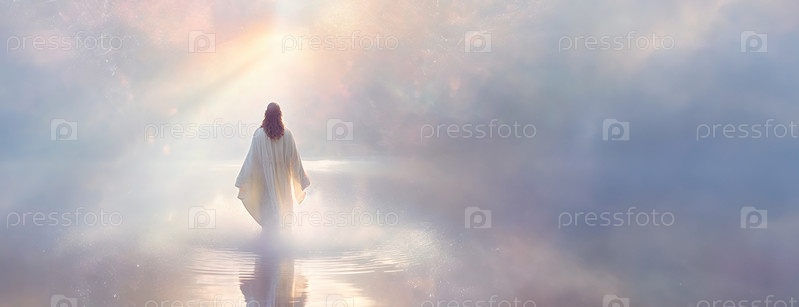Обтянутая светом фигура идет к зрителю по туманной дорожке, силуэт которой излучает небесное сияние и придаёт ему эфирное присутствие