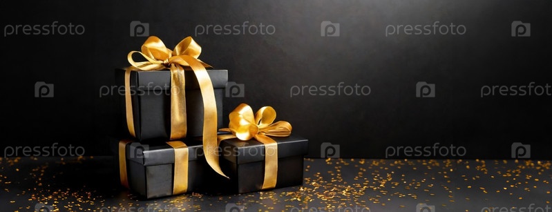 Роскошные черно-золотые коробки для подарков фона.Панорама с копировальным пространством