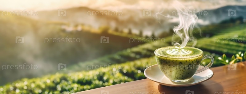 Aromatic Match tea with subtle foam art, overlooking the tea fields.Эта теплая чашка поставлена перед перспективой ярко-зеленых рядов чая.Панорама с копировальным пространством