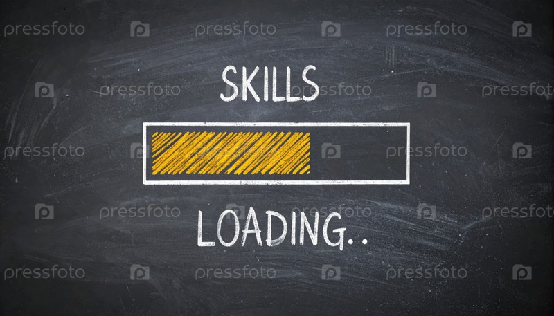Бара прогресса написана на доске с надписью skill load, символизирующей постоянное личное развитие, карьерный рост и непрерывное обучение