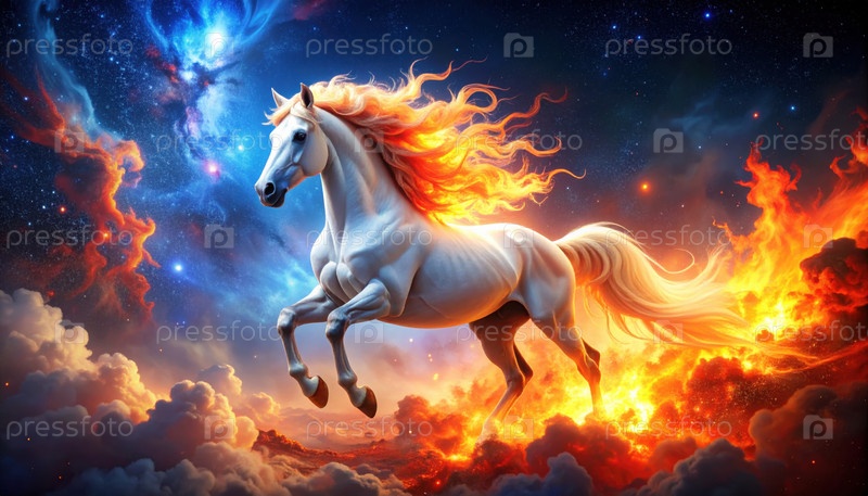 Мифический белый конь с огненной гривой, галопирующий через космическую сферу огня и звезд, символизируя свободу, фантазию и силу