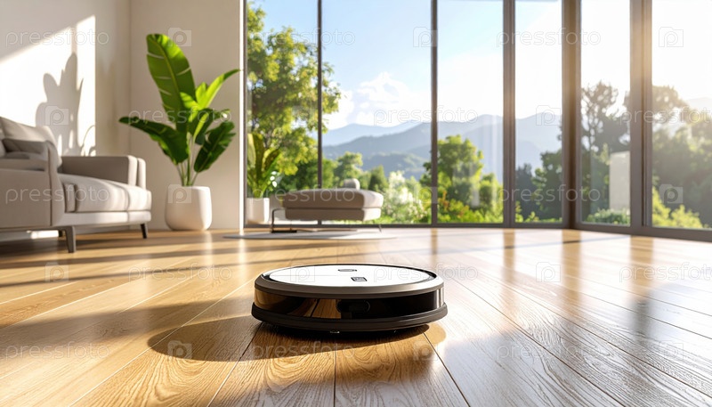 Умный робот-пылесос, передвигающийся по современному дому, отражает эволюцию умной жизни, чистых технологий и автоматизации