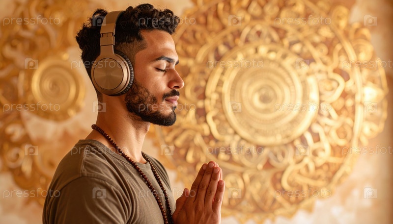 Человек медитирует с наушниками на фоне золотой мандалы, представляющей внутренний мир и современную внимательность, смешивающую духовные и цифровые сферы