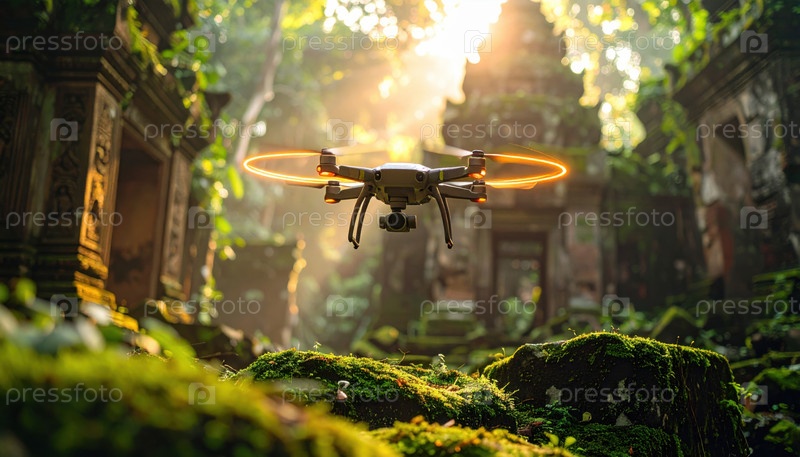 Дрон, летящий по руинам древних джунглей, подчеркивает исследования, археологию и современные технологии, сливающиеся с историческими местами