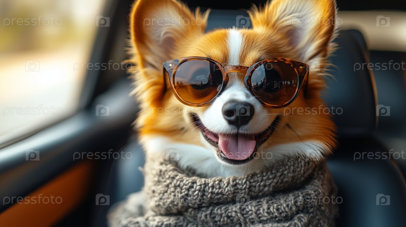 Собака-корги носит солнцезащитные очки и шарф в машине
