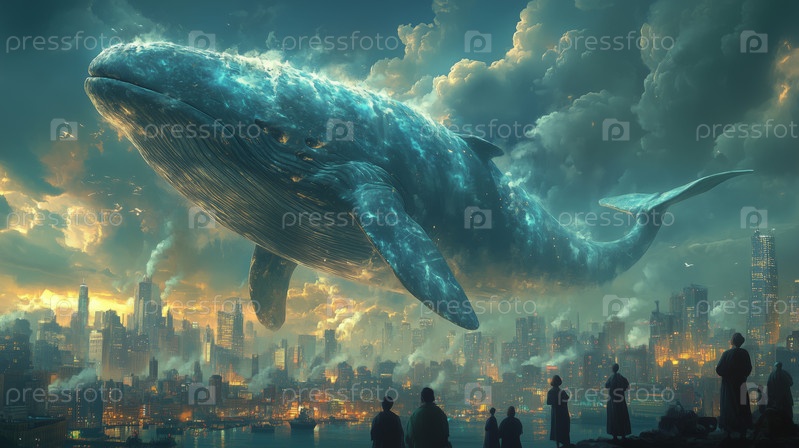 Гигантский эфирный кит плавает над футуристическим городом на закате
