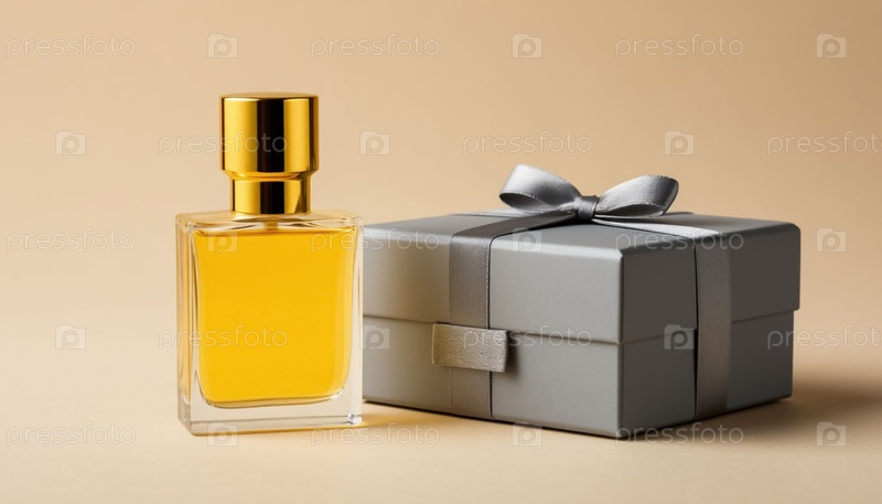 Желтая стеклянная бутылка для парфюмерии на пастельном фоне