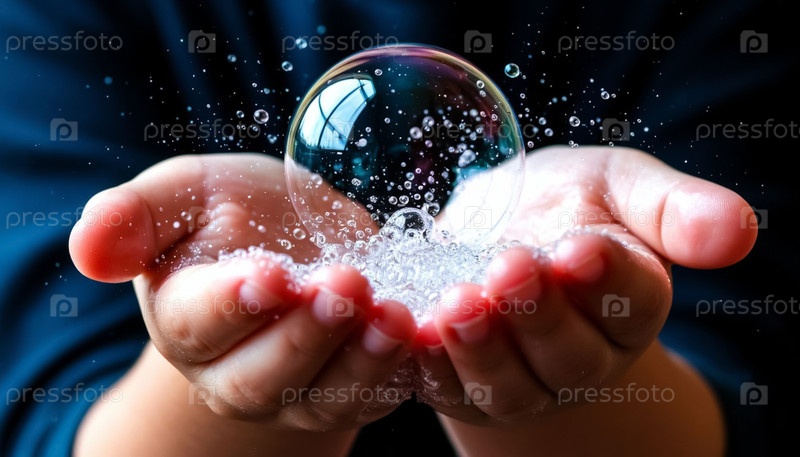 Мыльные пузыри в детских ладонях на черном фоне