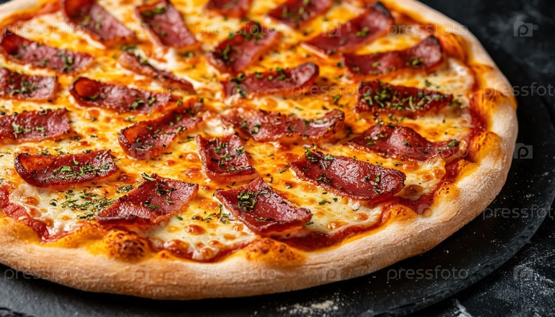 Мясо пицца с беконом крупный план на черном фоне