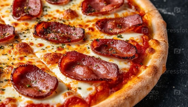 Мясо пицца с беконом крупный план на черном фоне