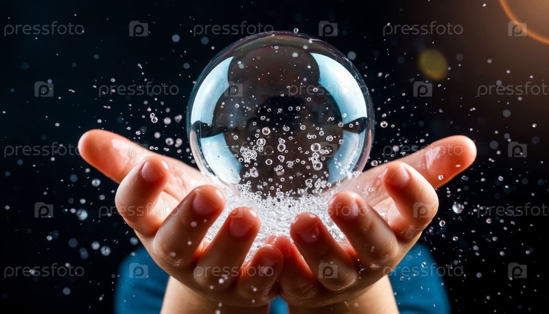 Мыльные пузыри в детских ладонях на черном фоне