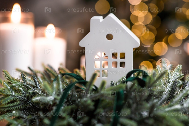 Новогоднее украшение в интерьере 2026 г. Белый скандинавский дом, ветви елей и свечи на столе в гостиной Концепция подготовки дома к новогодним праздникам