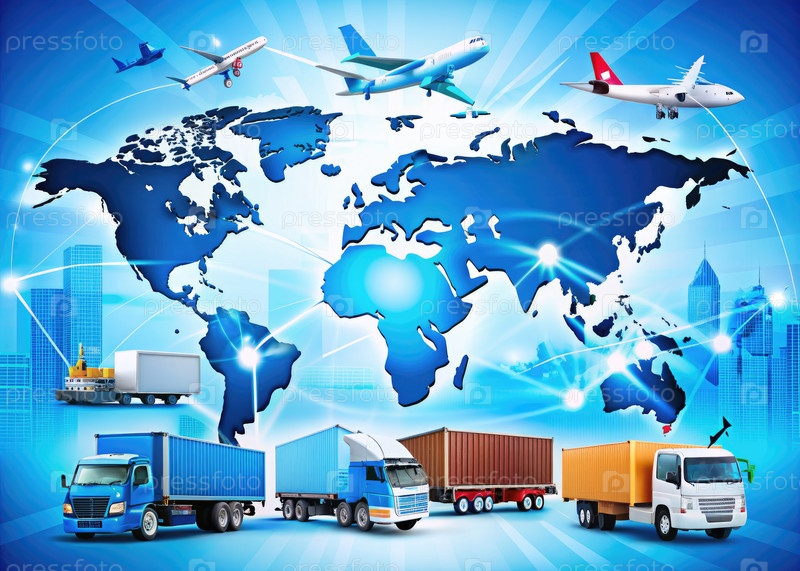 Синий фон с картой мира и грузовиками