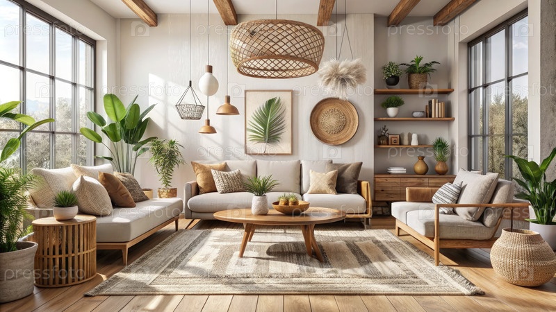 Современная гостиная с обилием естественного света, генерирующая ИИ