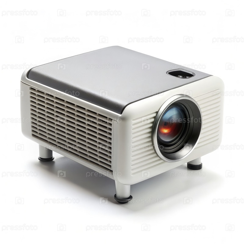 Небольшой проектор на белом столе, генерирующий ИИ