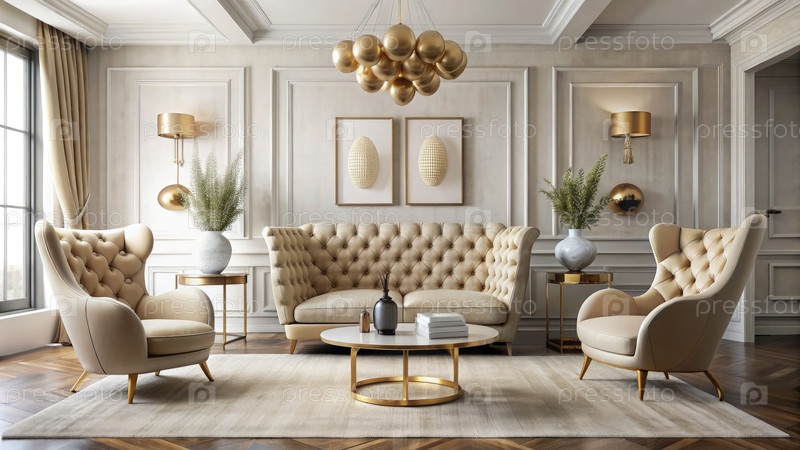 Элегантная гостиная с мебелью и люстрами