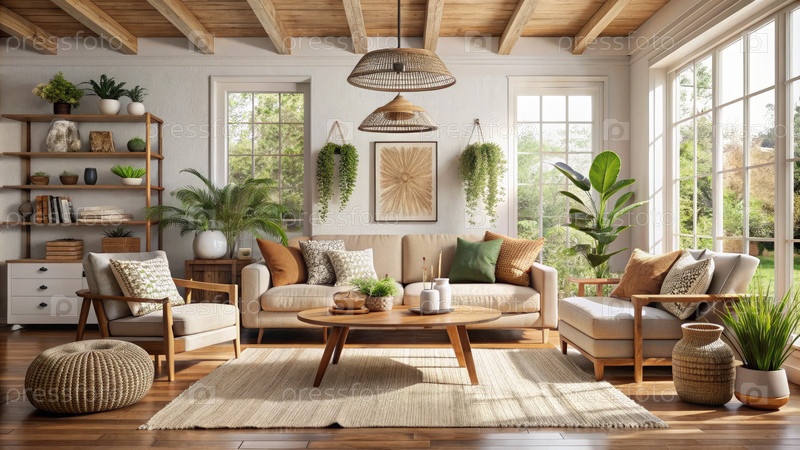 Современная гостиная Boho Farmhouse с большим количеством окон