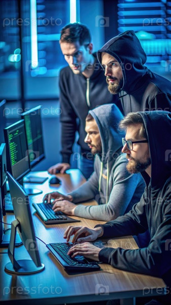 Группа людей, сидящих за компьютером и генерирующих ИИ