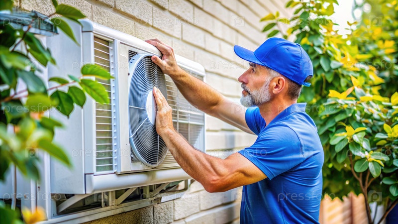 Мужчина в синей рубашке и шляпе работает на кондиционере