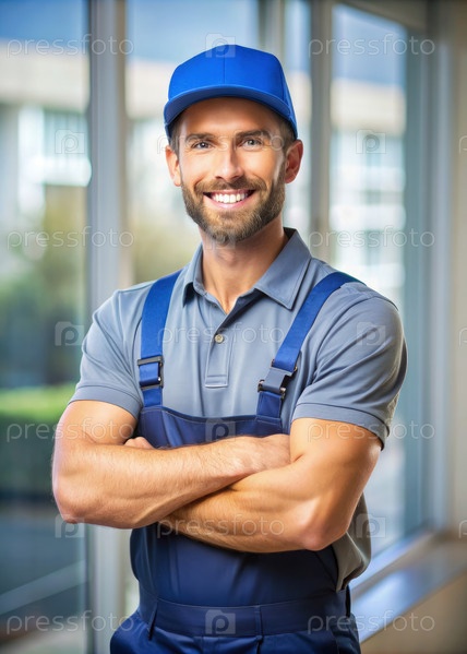 Внутренний поставщик услуг в комбинезоне и синей шляпе. генератив AI Мужчина