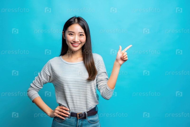 Молодая женщина указывает пальцем на что-то