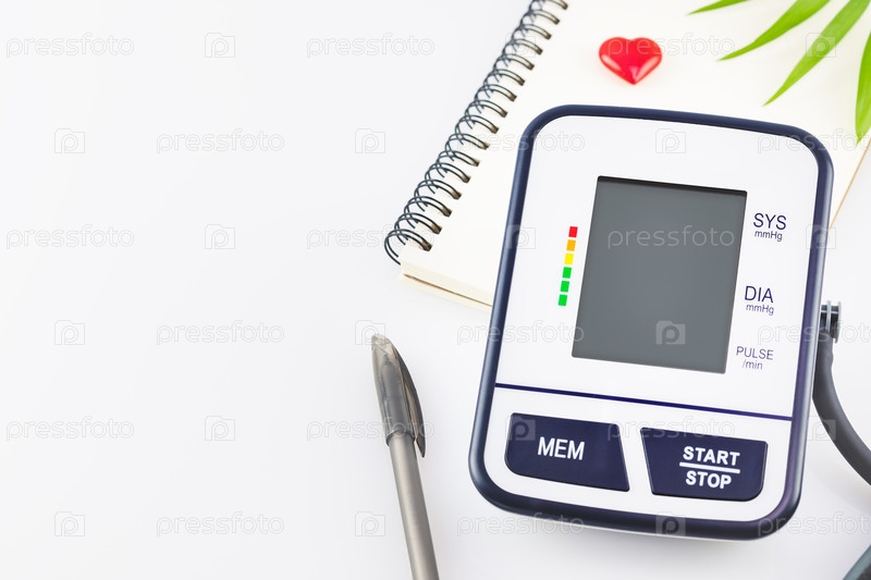 Цифровой монитор артериального давления, ноутбук, ручка на белом фоне с авторским правом. Концепция медицинского осмотра, контроля здоровья и контроля кровяного давления. Место работы врача