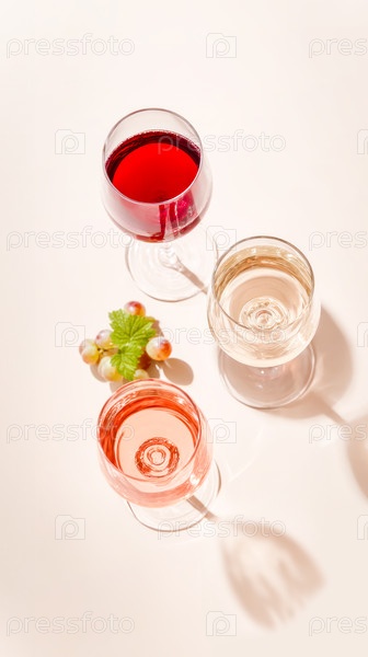 Три бокала с красным, белым и розовым цветом на светлом фоне с виноградом. Концепция дегустации вин, натуральные вина, выбор сомельеров и высококачественное содержание напитков