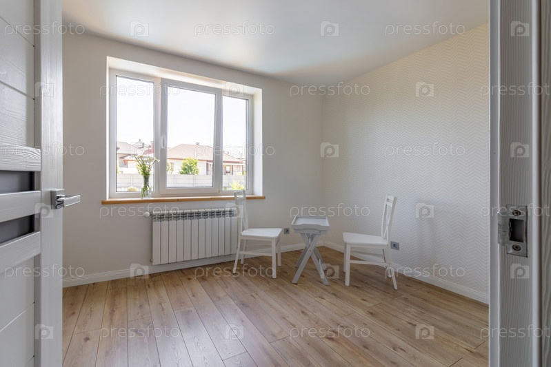 Яркая и минималистичная комната с деревянным полом, окном с видом на улицу и простыми белыми мебелью создает спокойную атмосферу