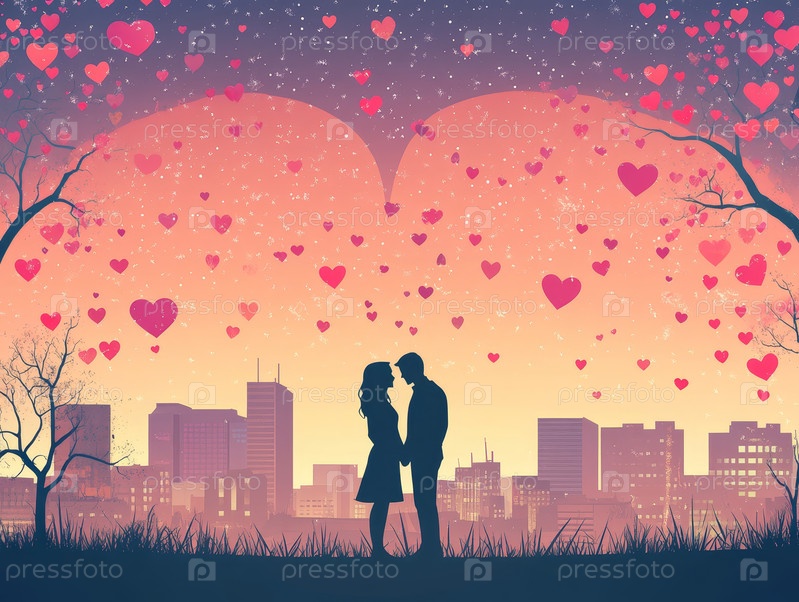 Силуэт пары под аркой в форме сердца с горизонтом города на закате создает романтическую и мечтательную атмосферу, идеально подходящую для празднования любви
