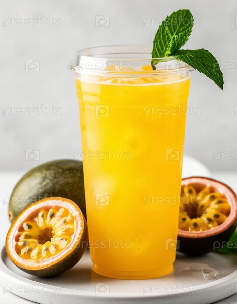 Желтый лимонад с манго и страстными фруктами в стакане