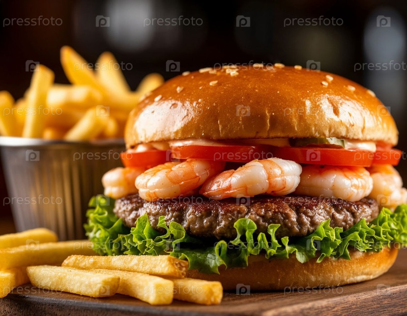 Бургер с морепродуктами и картофелем на темном фоне