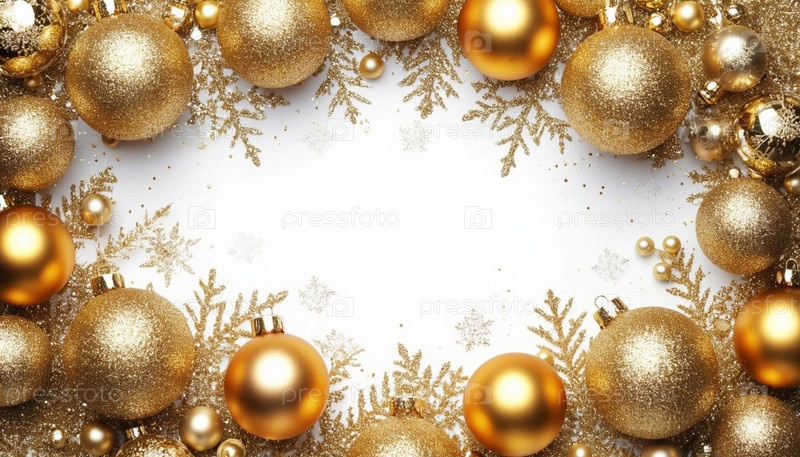 Новогодний фон с золотыми шарами и блеском. Копировать пространство, рамку