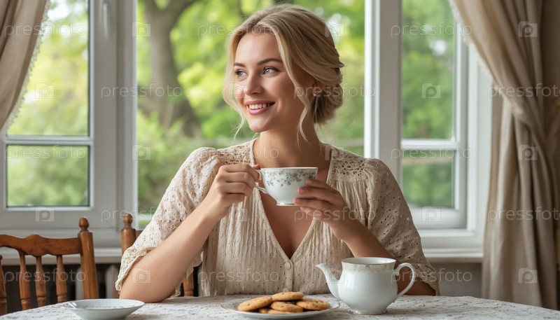 Rustic Tea Moment: Blonde Woman в цветущем платье от Countryside Window