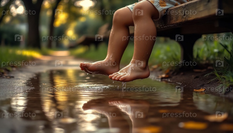 Ноги ребенка сидят на деревянной палубе над лужайкой