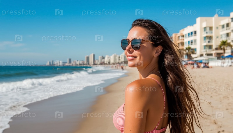 Спортивная девушка в купальнике на пляже на фоне курортного города