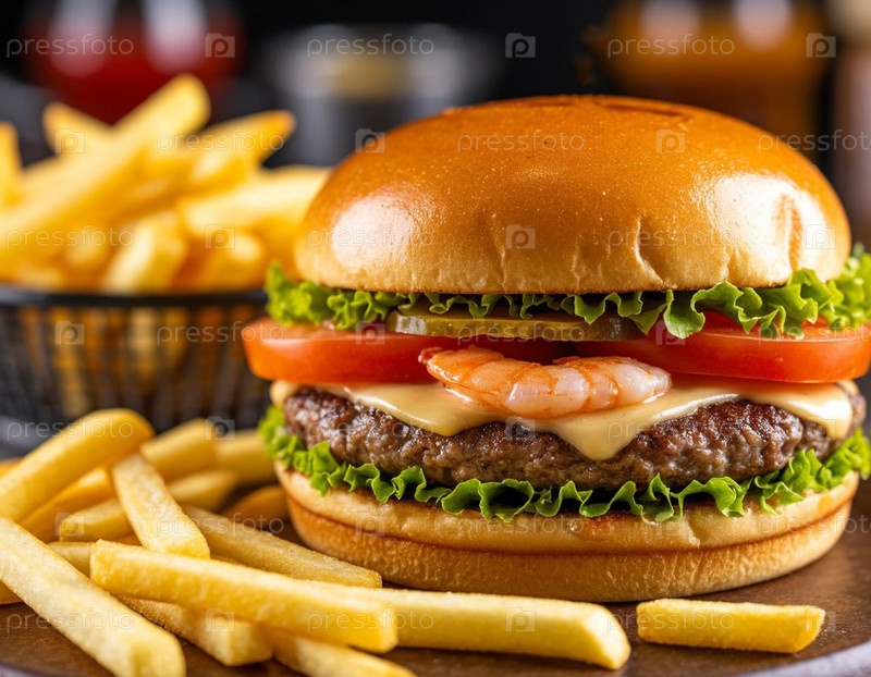 Бургер с морепродуктами и картофелем на темном фоне