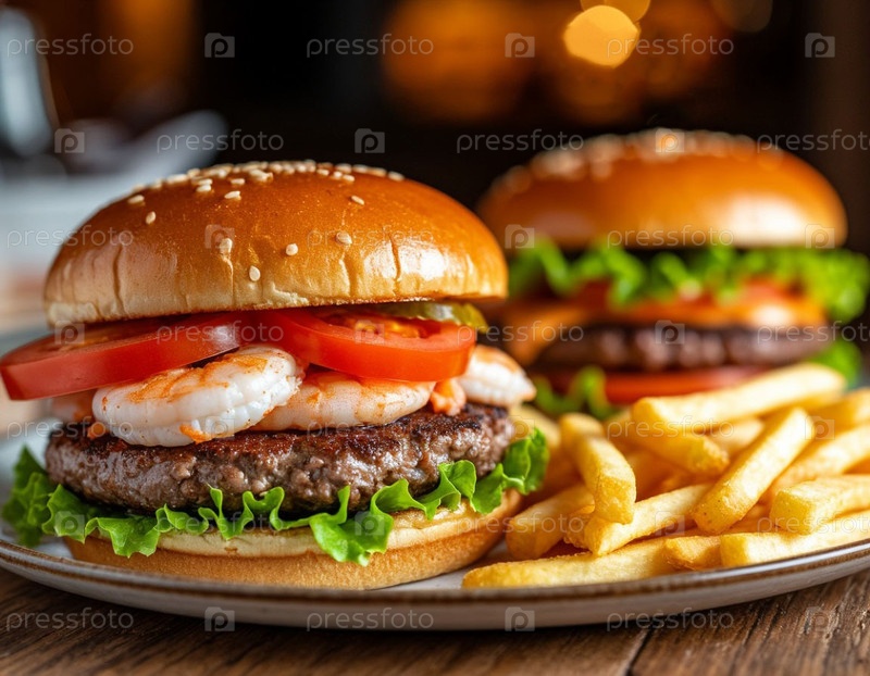 Бургер с морепродуктами и картофелем на темном фоне