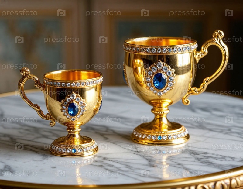 Золотые чаши с драгоценными камнями на столе