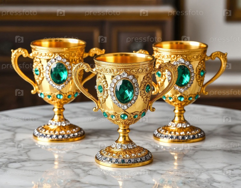 Золотые чаши с драгоценными камнями на столе