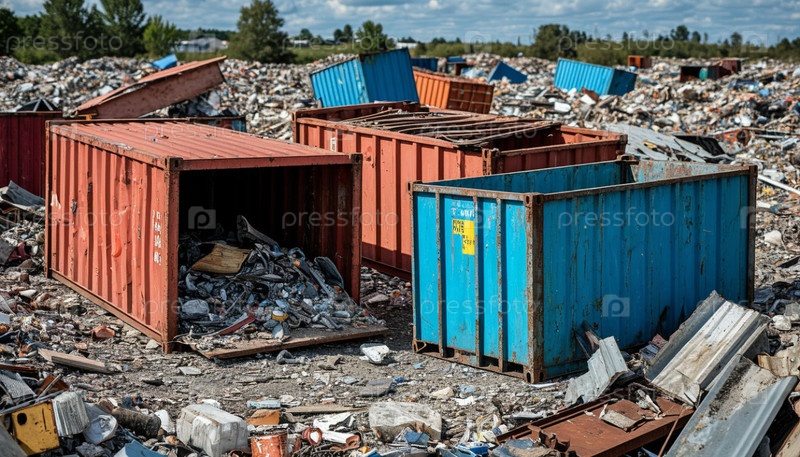 Пустые контейнеры на свалке, концепция упадка торговли и экономики