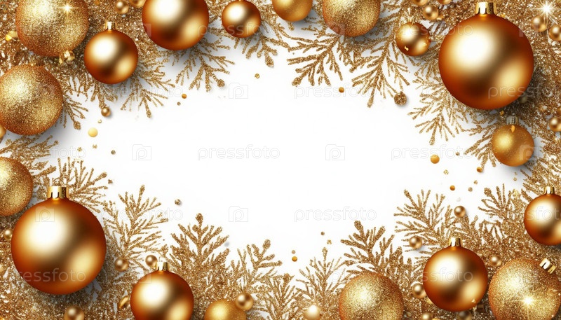 Новогодний фон с золотыми шарами и блеском. Копировать пространство, рамку