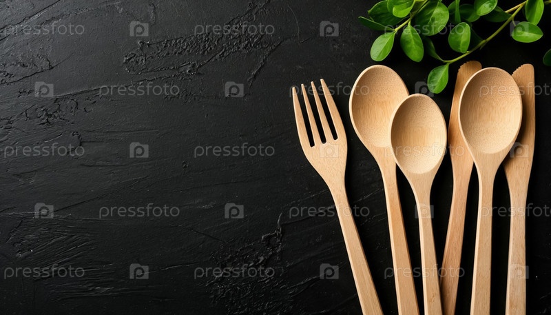 Деревянные столовые приборы - ложки и вилки на темном фоне