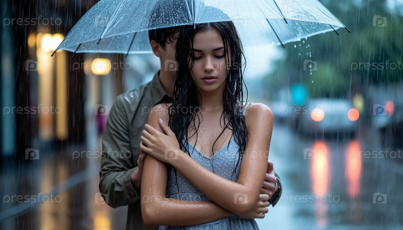 Молодая пара влюбляется в мальчика и девочку в городе под зонтиком во время дождя