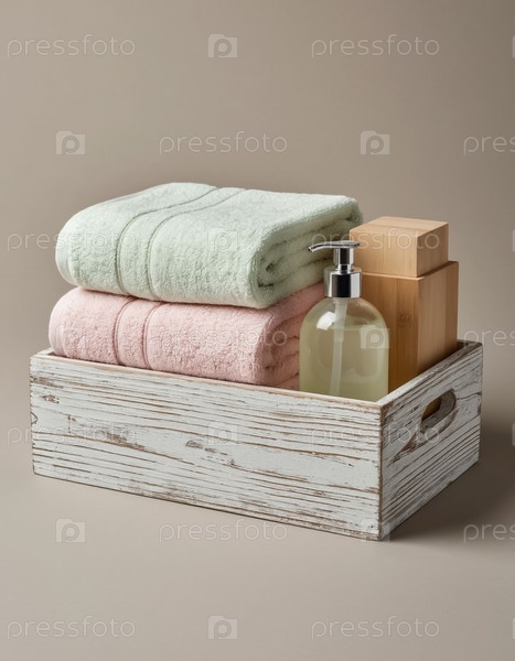 Пастельные полотенца и гель для мытья лица в деревянной белой винтажной коробке