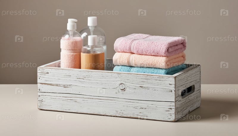 Пастельные полотенца и гель для мытья лица в деревянной белой винтажной коробке