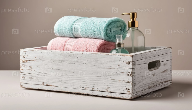 Пастельные полотенца и гель для мытья лица в деревянной белой винтажной коробке