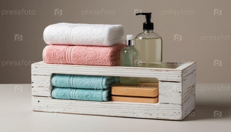 Пастельные полотенца и гель для мытья лица в деревянной белой винтажной коробке