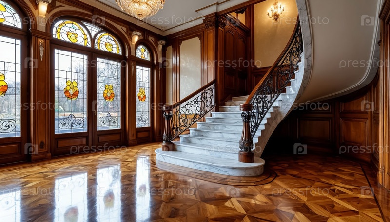 Жилой интерьер богатого особняка в стиле модерн, паркет, дерево, мрамор